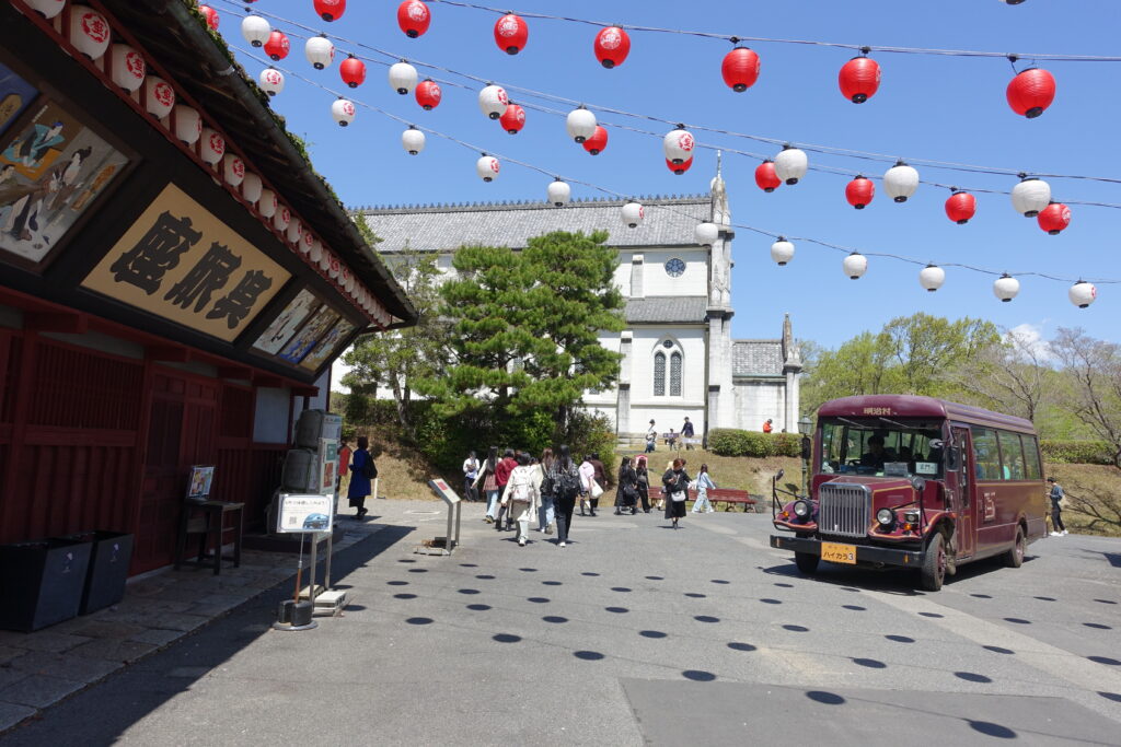 明治村はただ建築物だけでなく、レトロバスやSLや京都市電も走行しているなど、移動手段も当時のものを再現している。時々、森の奥から聞こえている蒸気機関車の汽笛は、まるで文明開化の音にも感じてくる。