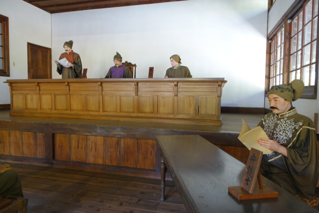 明治時代の法廷。現代とは違って、弁護士の立場は検察より下だったらしい。