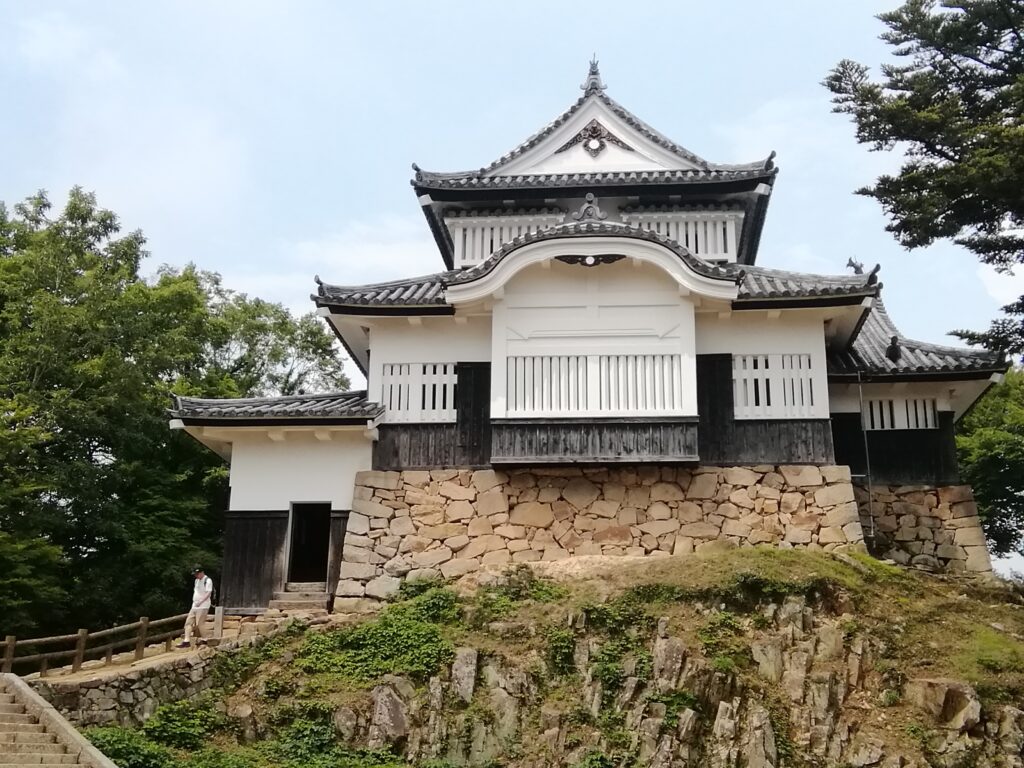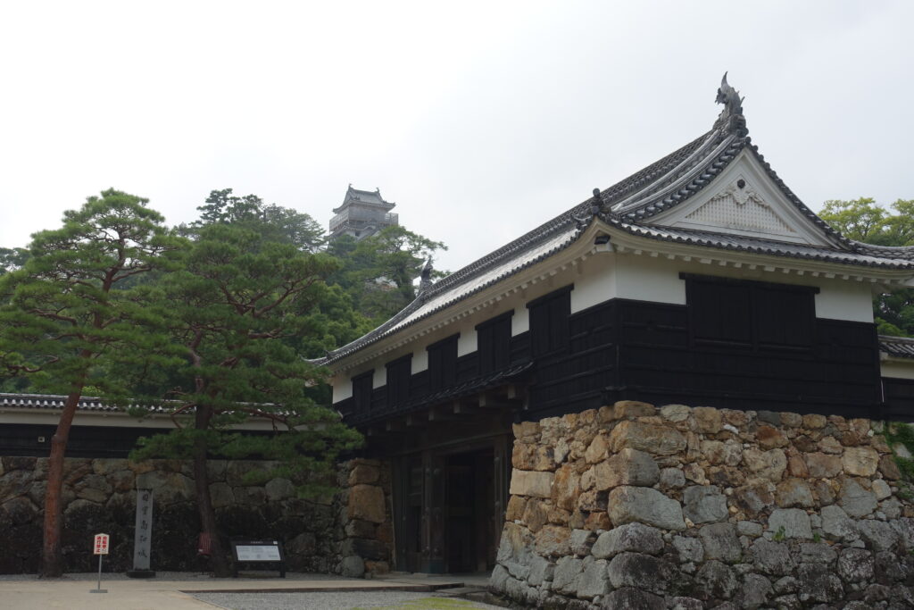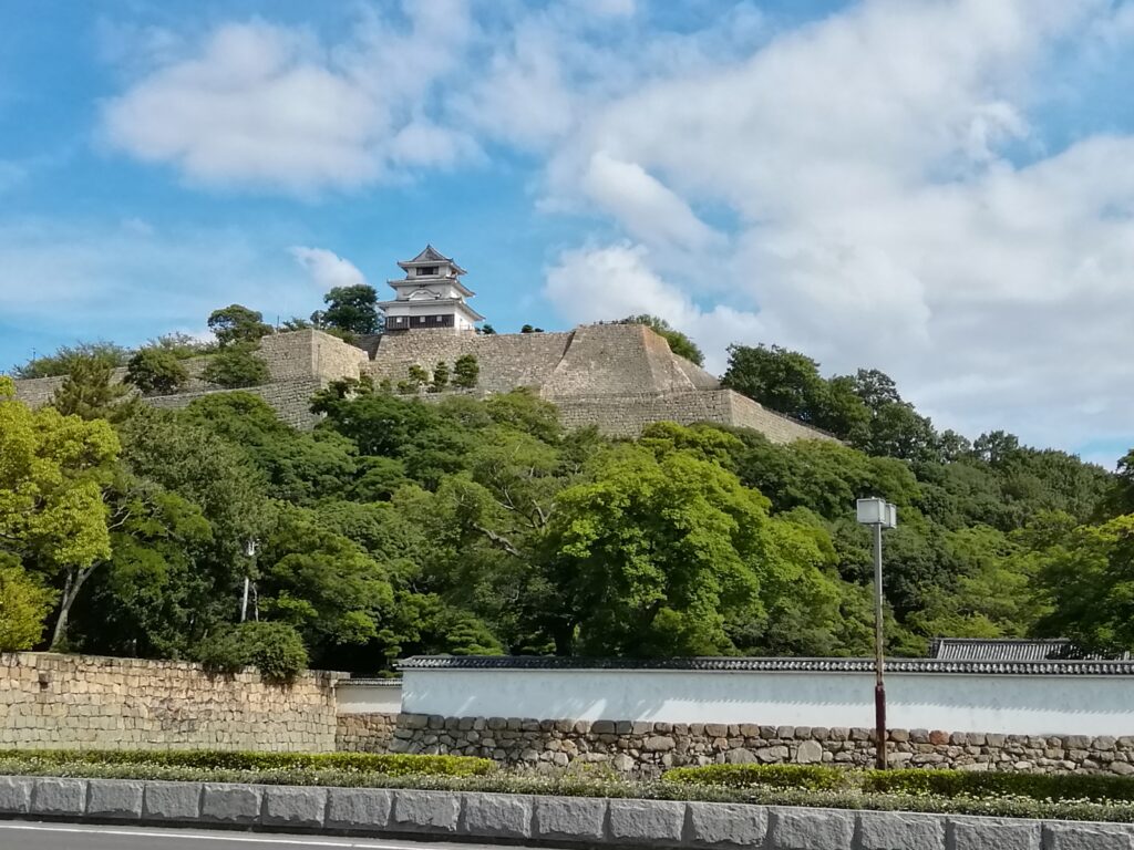 丸亀城は約60mにも及ぶ高石垣が有名です。一方で丸亀城の天守は現存天守の中ではもっとも小さく、高石垣と天守のギャップが見所の一つでもあります。